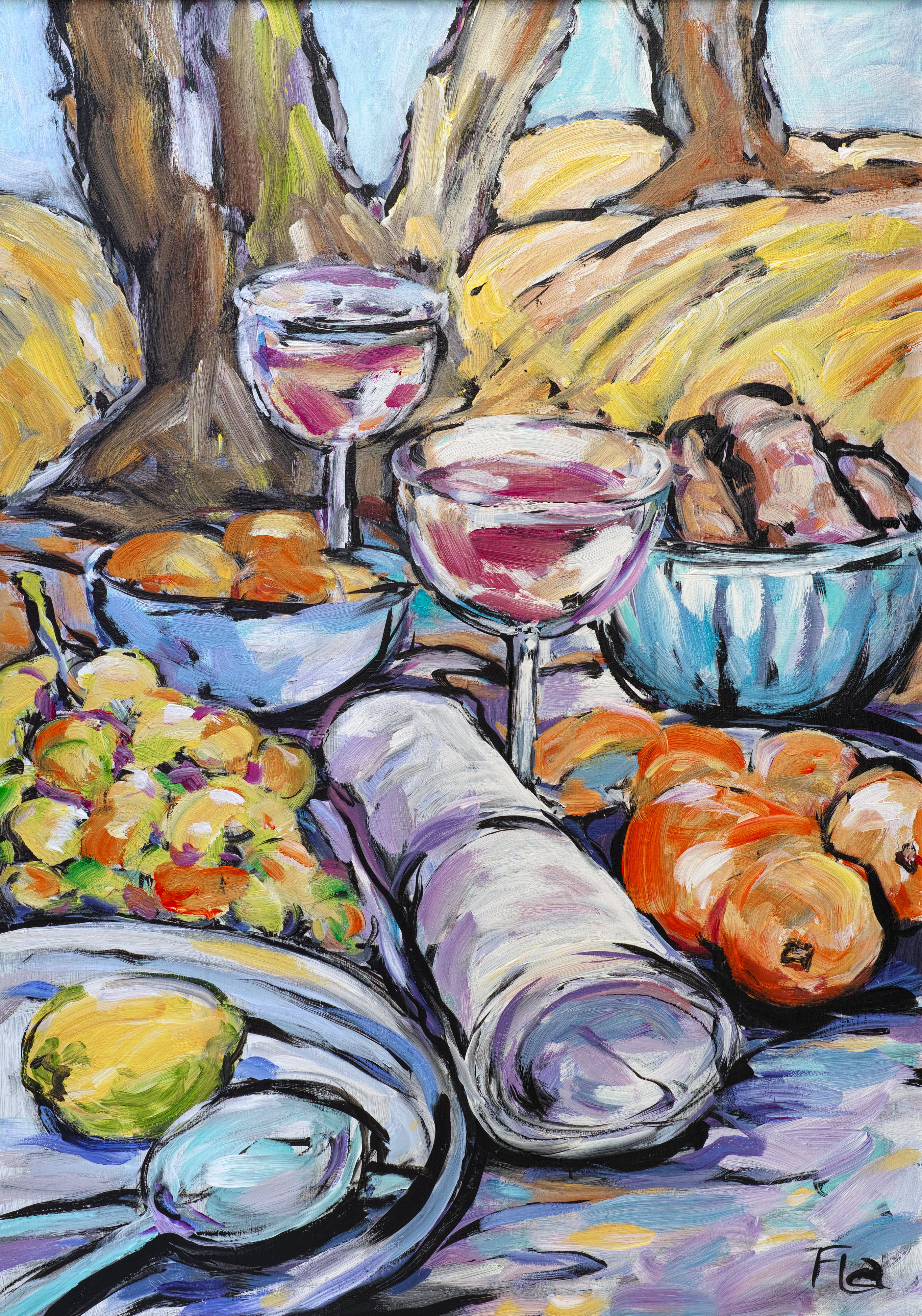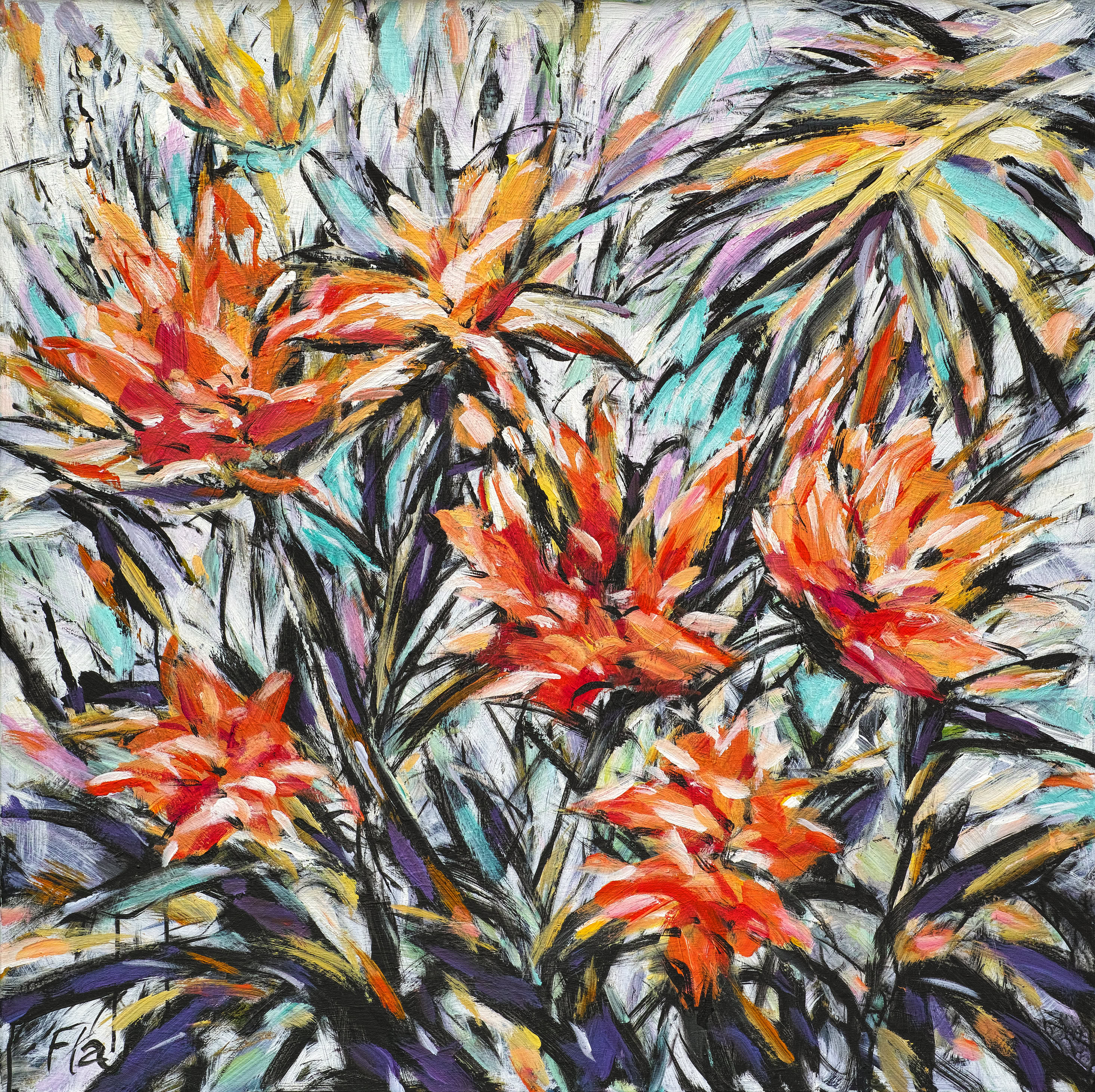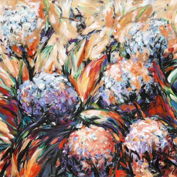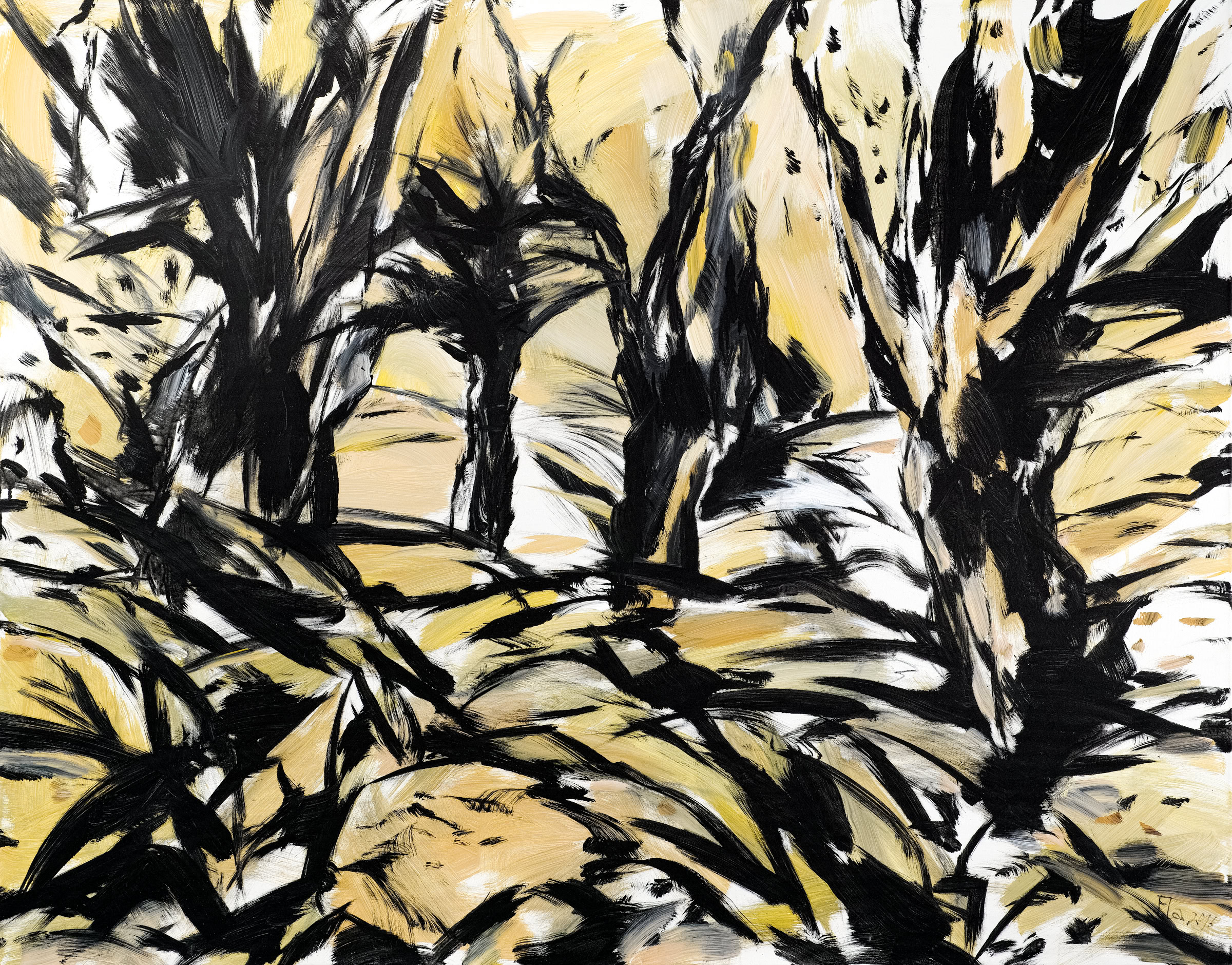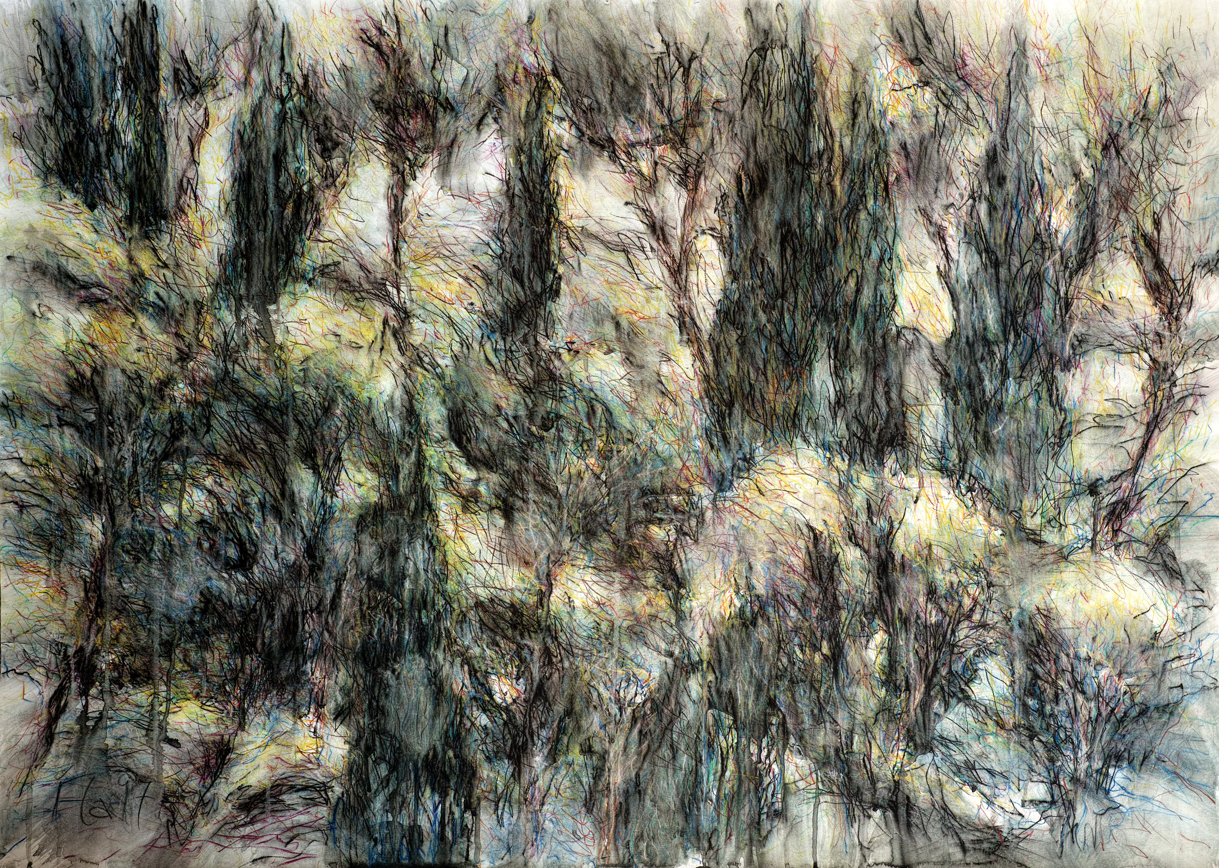 Die Jahre 2015–2019 dürfen für den Maler Peter Flachmann als eine überaus fruchtbare Zeit gesehen werden. Neben seinem zeichnerischen Oeuvre entstanden in diesem Zeitraum verschiedene Werkgruppen in der Technik der Acrylmalerei, allen voran die mediterranen Landschaftsveduten, ferner die Stillleben und die privaten Gartenansichten. Durchgängiges Zeichen der Kunst von Peter Flachmann wird nun der leidenschaftliche, der expressive Duktus, die beherzt gesetzte Linie, zum einen als dominante Kontur, besonders bei Felsformationen und Gerölllandschaften, zum anderen als kräftige Binnenstruktur, so besonders bei den Olivenbäumen, dem indifferent wuchernden Gartengrün und den Meereswogen. Das Vibrieren, das Oszillieren der Form korrespondiert stets mit den changierenden, den in allen Zwischentönen schillernden Farben.