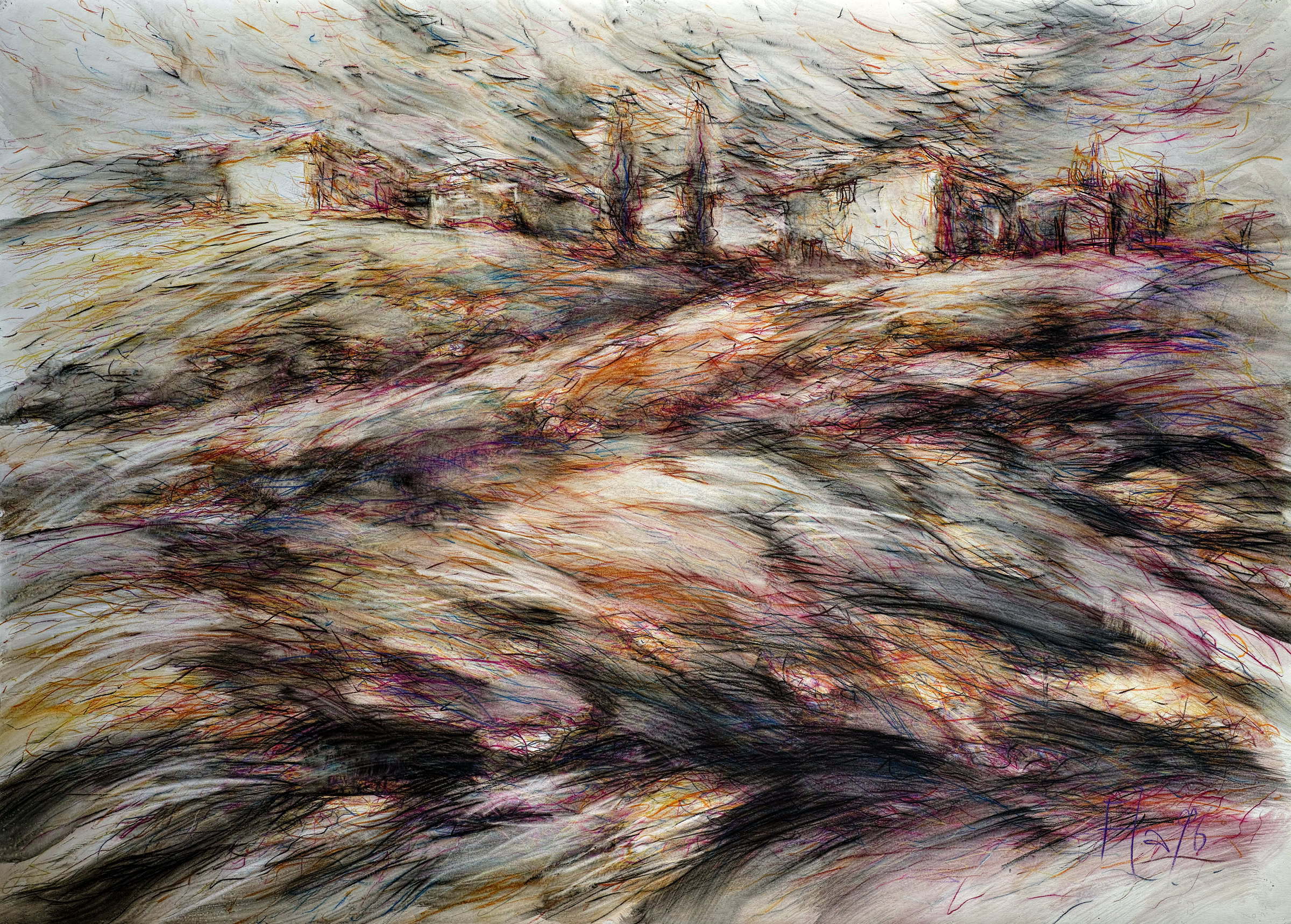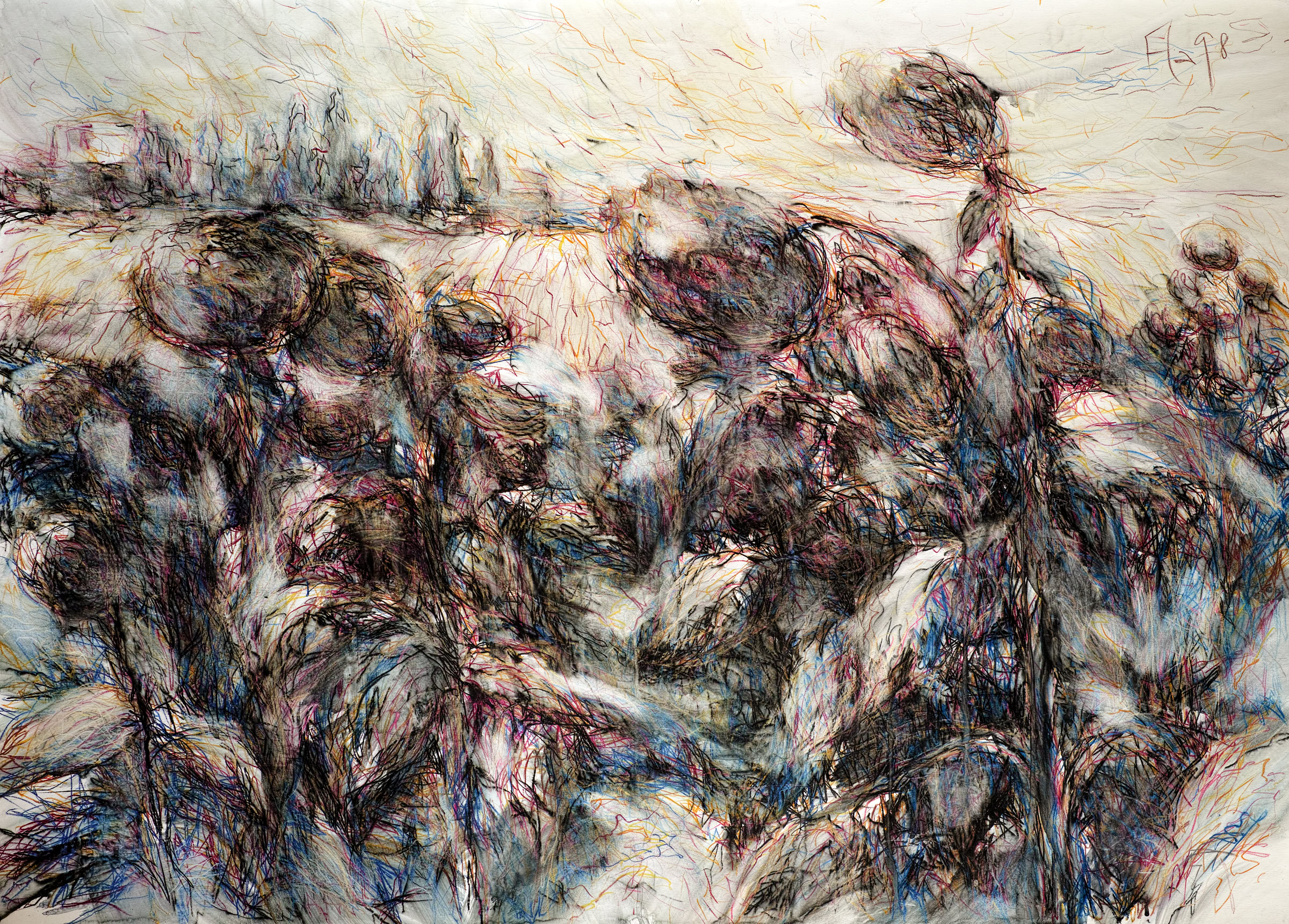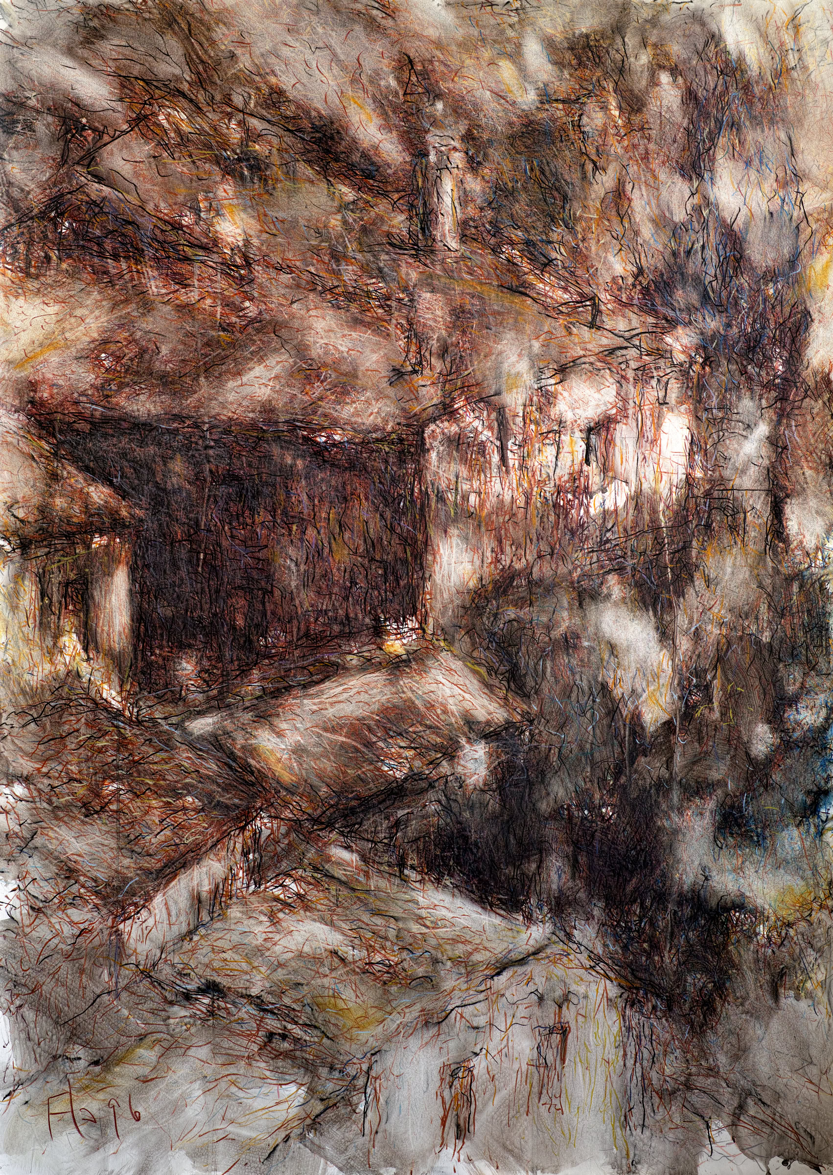 Eine große Serie über die Eindrücke, die Peter Flachmann hier erlebte, hat er vor Ort in vielen kleinen Skizzen und Fotos festgehalten. Sie dienten ihm später in seinem Atelier als Vorgabe für großformatige Malerei auf Leinwand und farbige Zeichnungen auf Karton. Einige Arbeiten aus dieser Serie sind nachfolgend zu sehen.