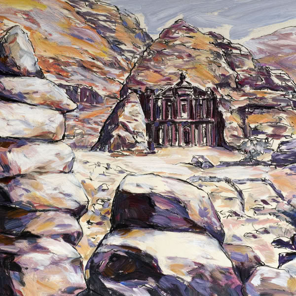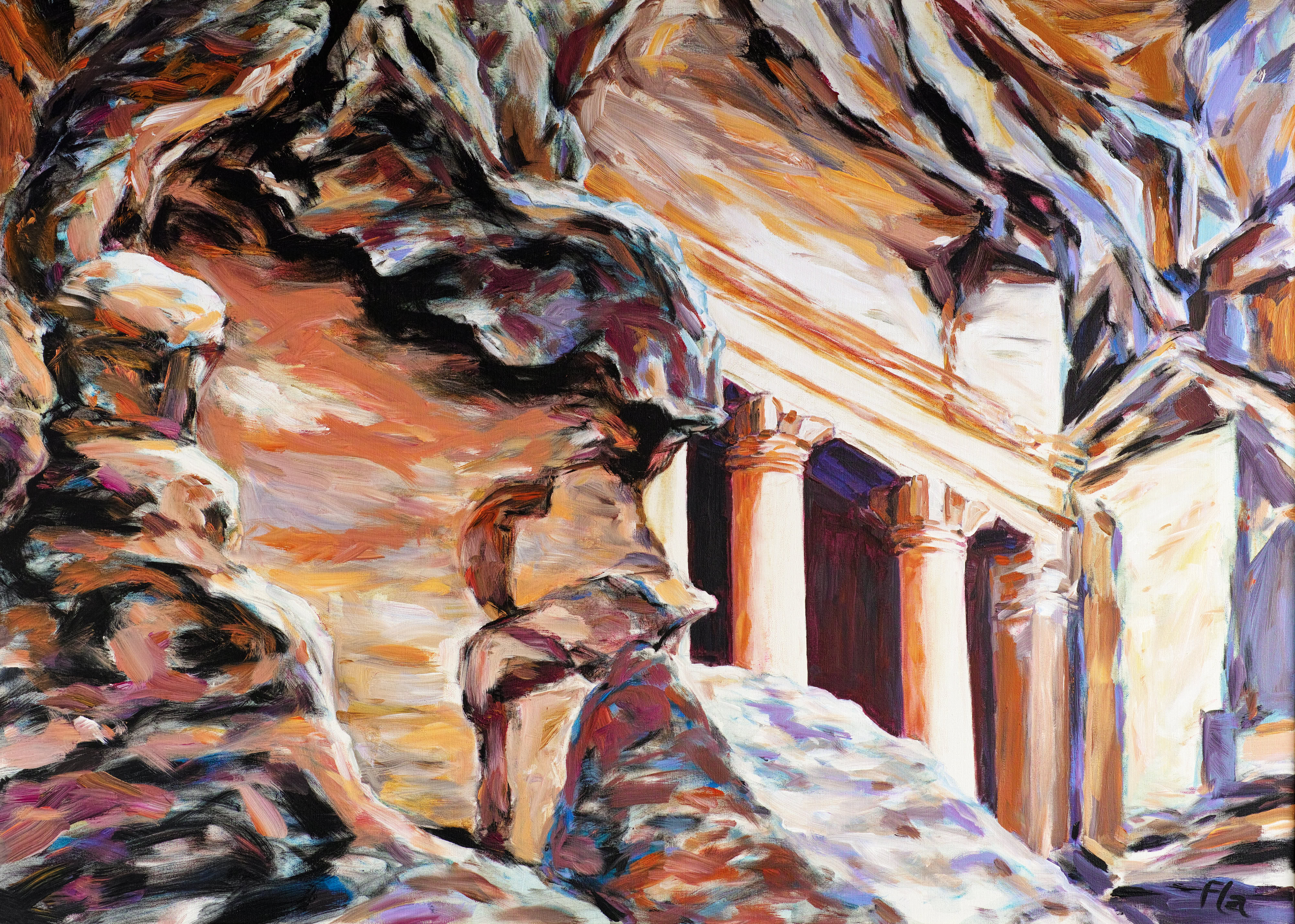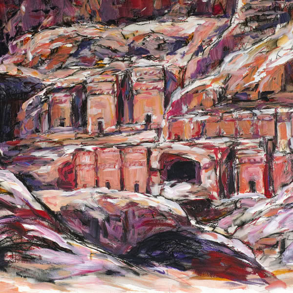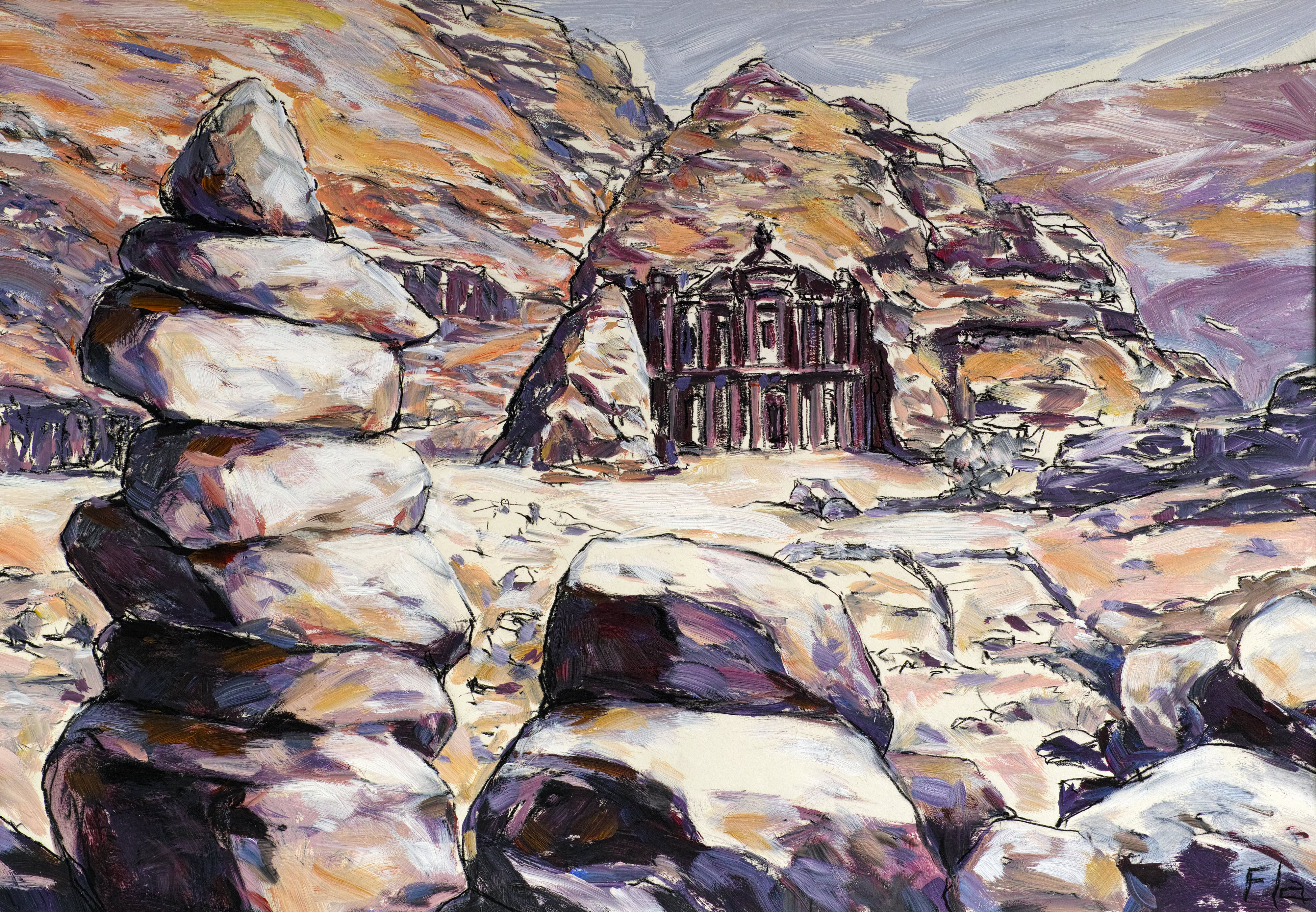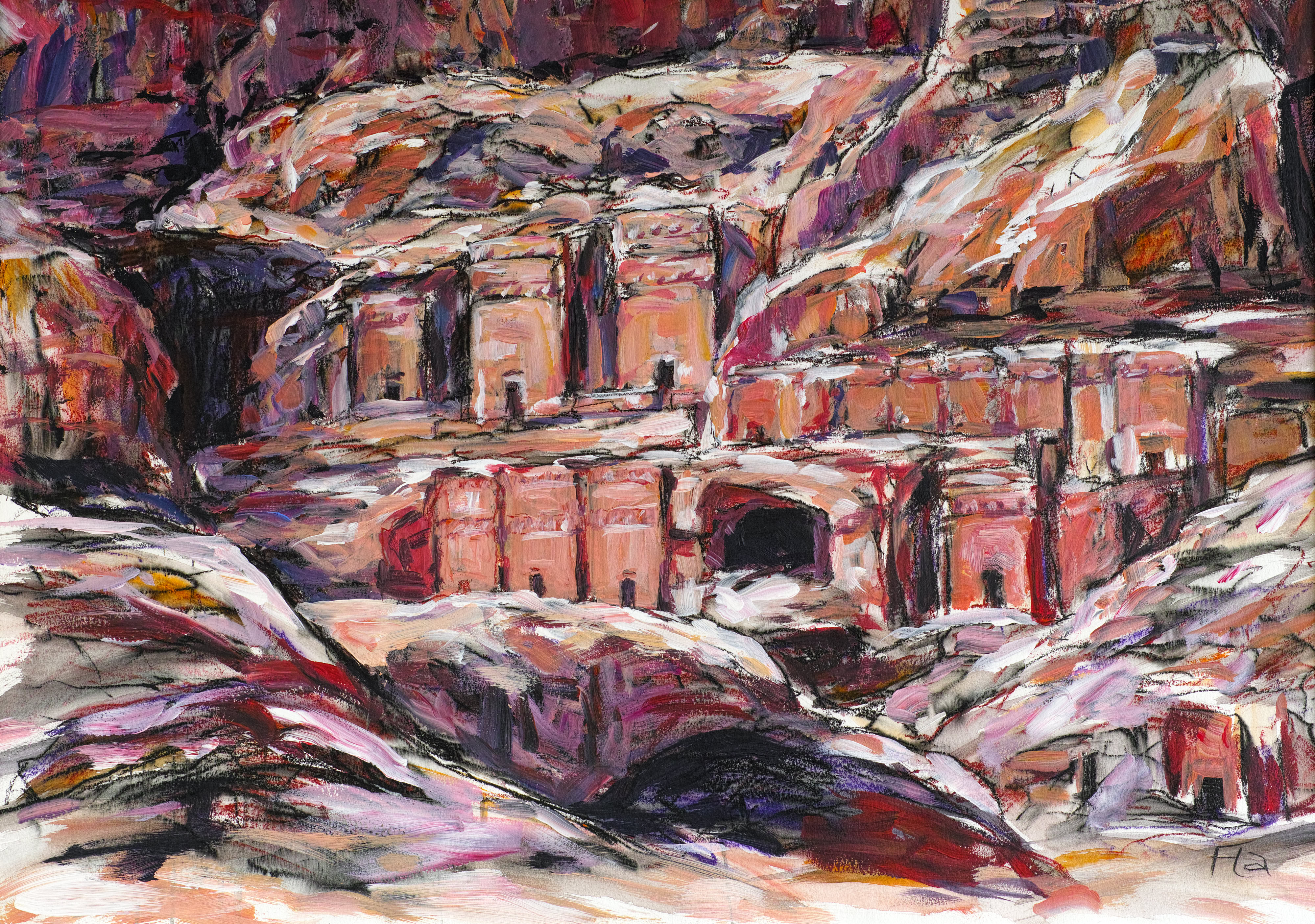 Eine Studienreise nach Petra in Jordanien ermöglichte es Peter Flachmann im Oktober 2018, sich mit dieser geheimnisvollen Hauptstadt der Nabatäer, die vor mehr als 2000 Jahren in den Shara Bergen im heutigen Jordanien erbaut wurde, intensiv künstlerisch zu beschäftigen.