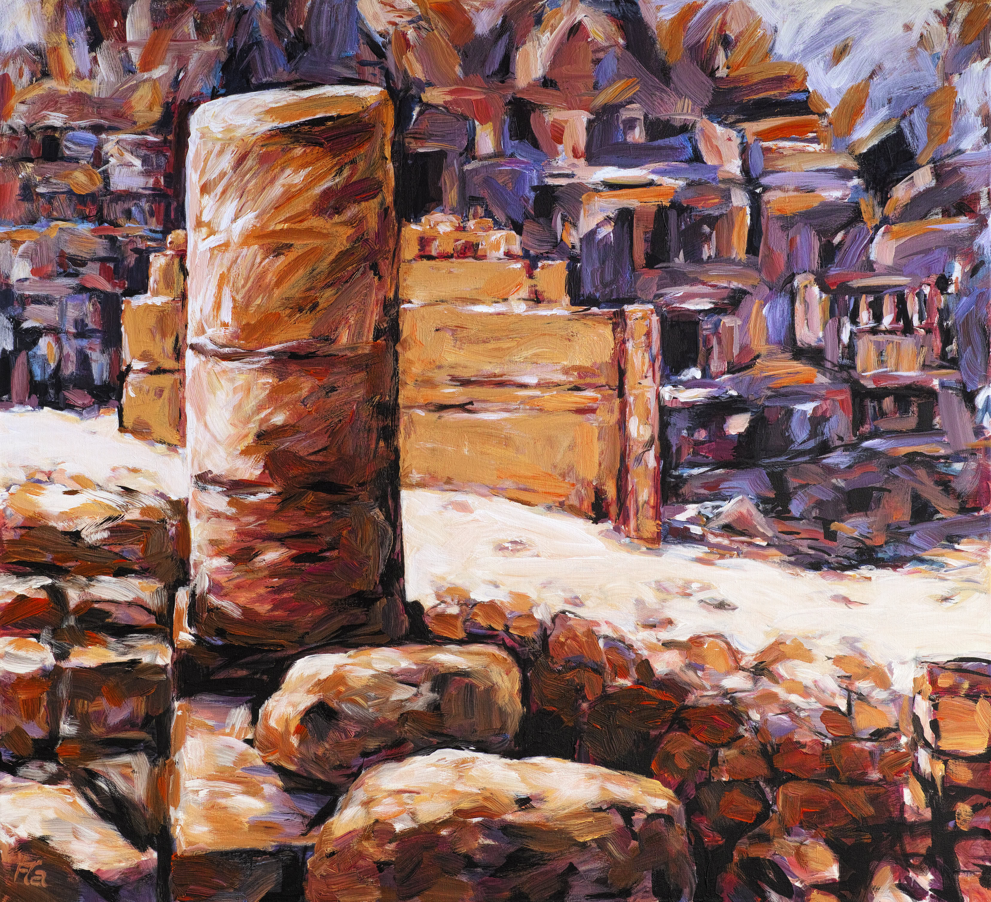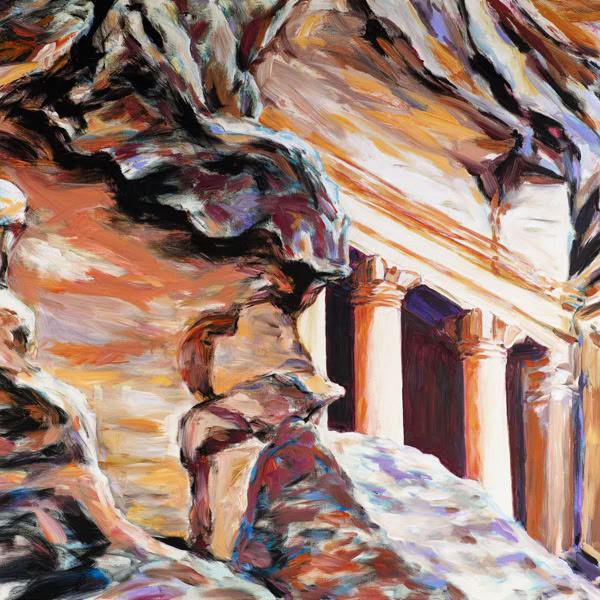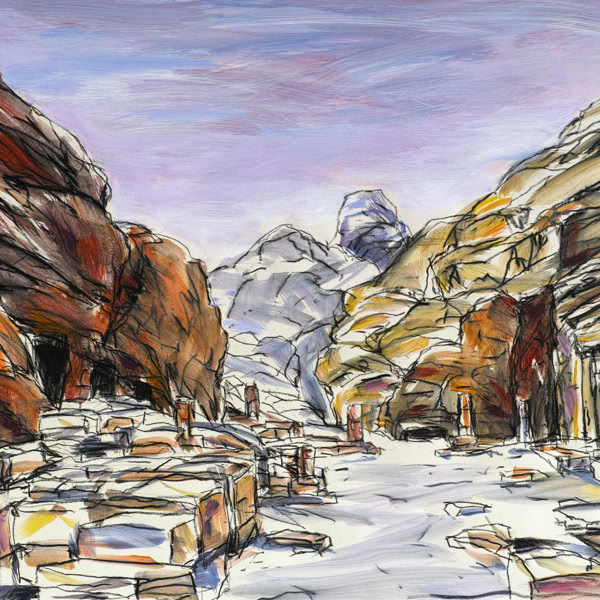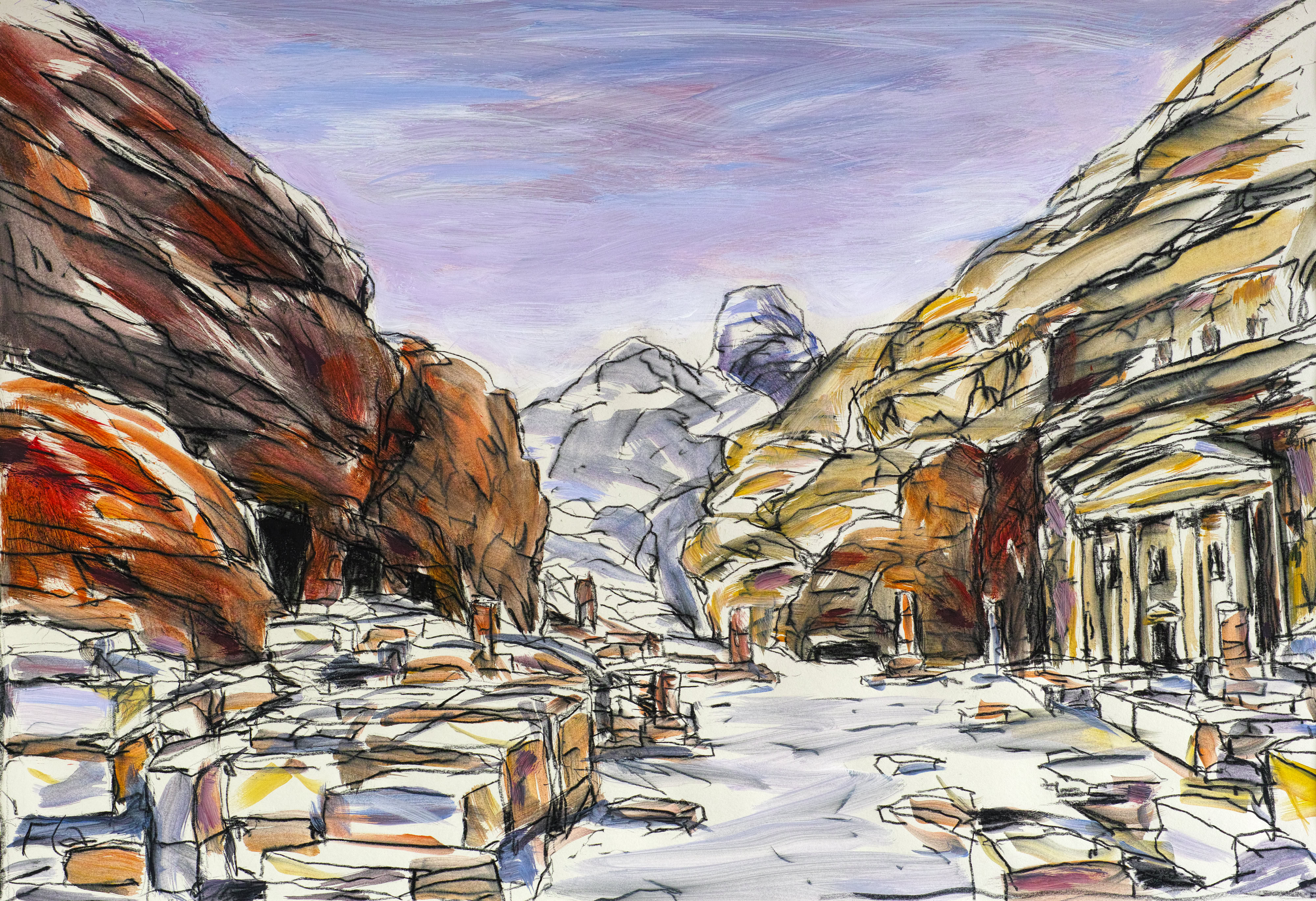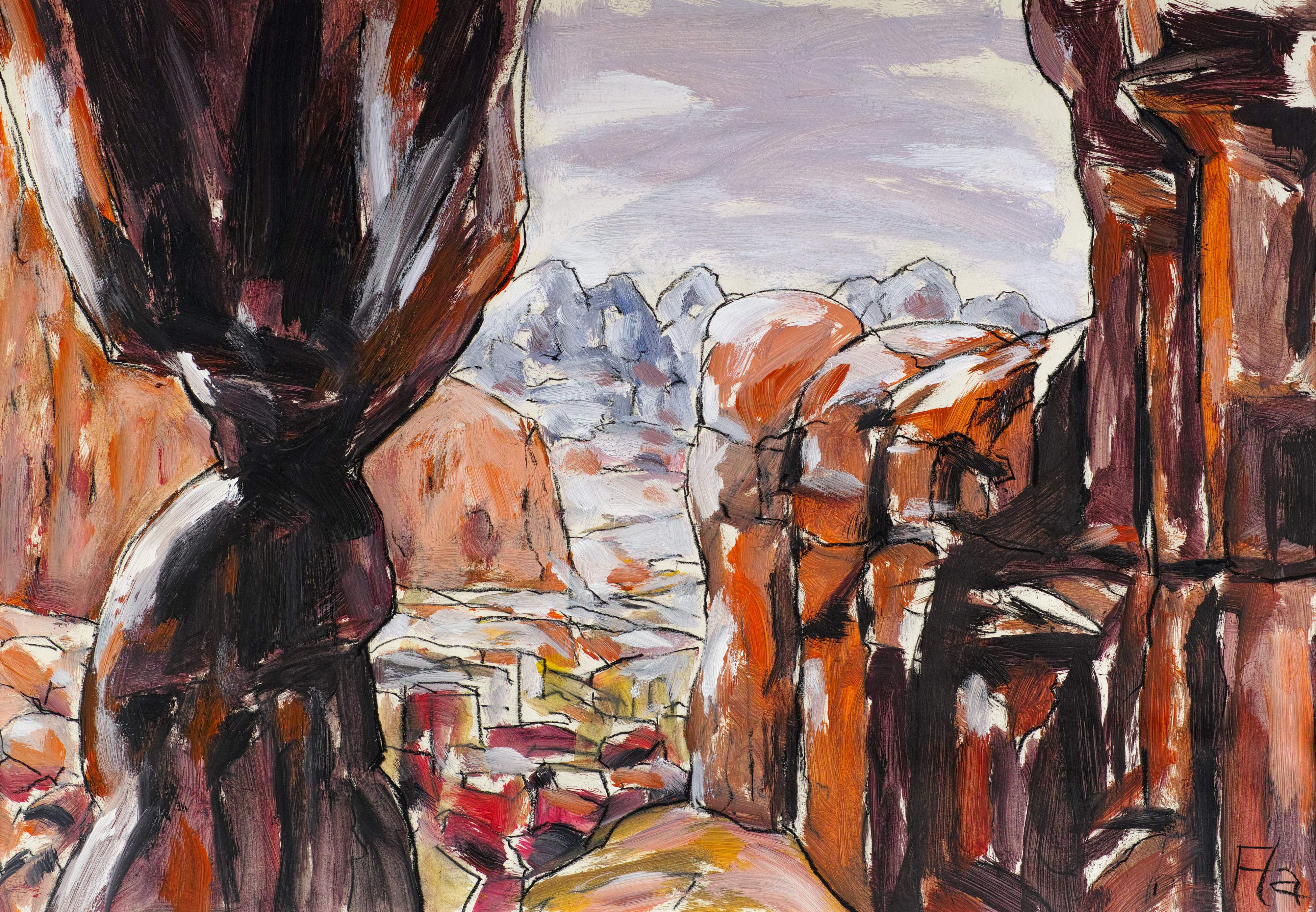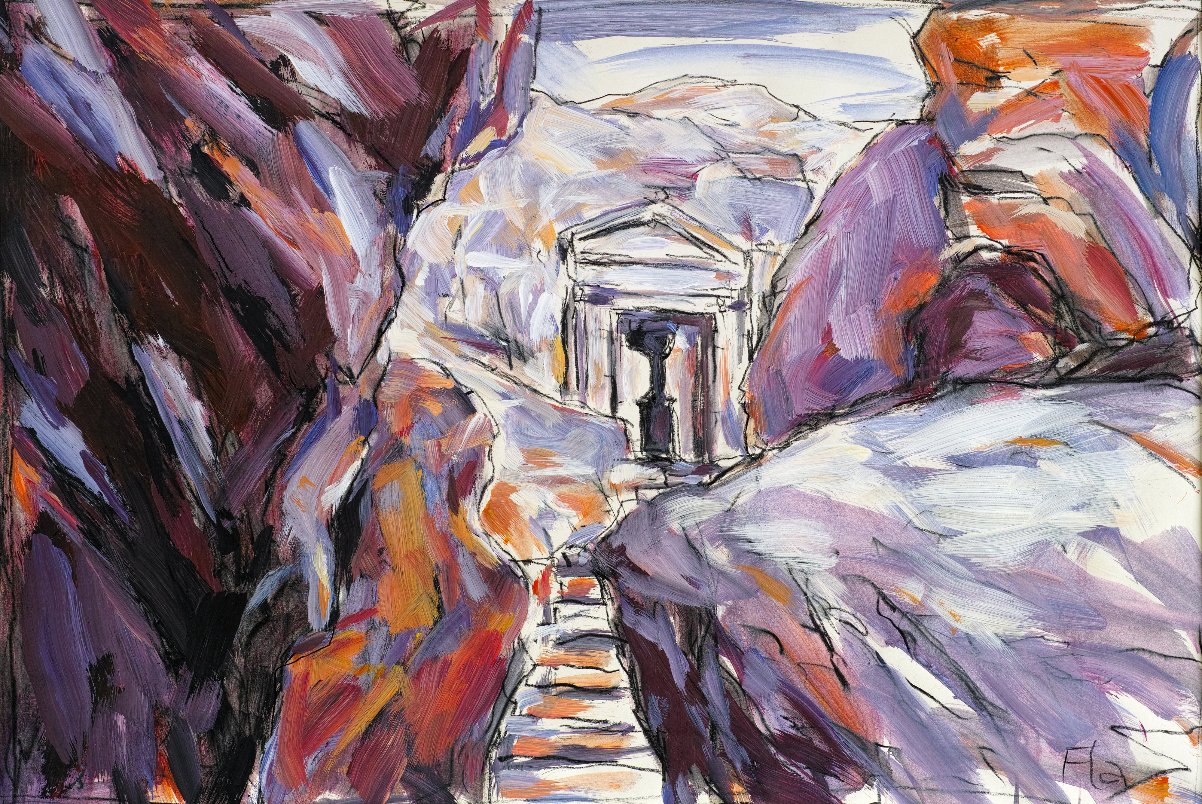 Eine Studienreise nach Petra in Jordanien ermöglichte es Peter Flachmann im Oktober 2018, sich mit dieser geheimnisvollen Hauptstadt der Nabatäer, die vor mehr als 2000 Jahren in den Shara Bergen im heutigen Jordanien erbaut wurde, intensiv künstlerisch zu beschäftigen.